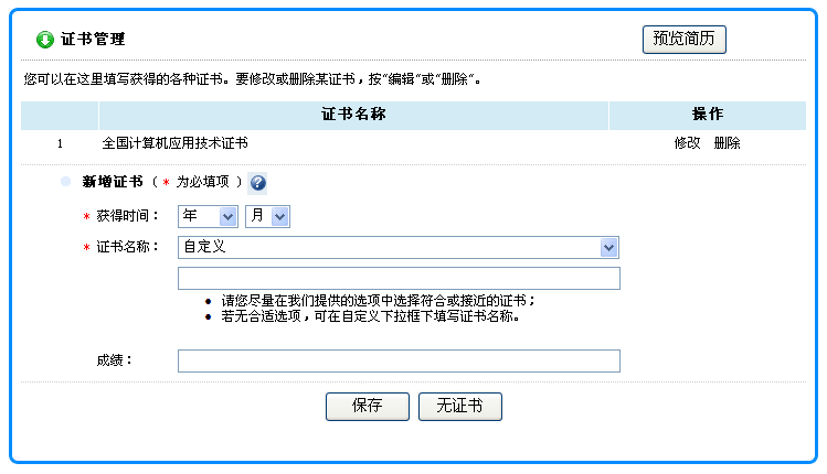 1)進(jìn)入"個人管理中心",位于左側(cè)子欄目的"簡歷維護(hù)",點擊"個人證書管理"。