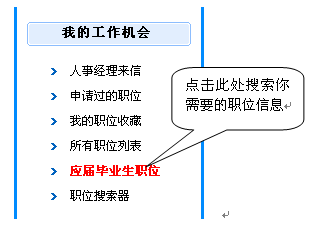 注意:如果你是應(yīng)屆畢業(yè)生可以進(jìn)入"個人管理中心",位于左側(cè)子欄目的"我的工作機會",點擊"應(yīng)屆畢業(yè)生職位"如下圖所示: